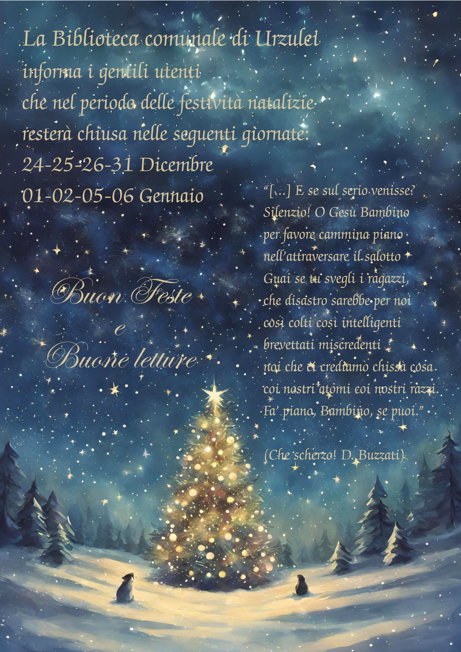 Si informa la cittadinanza che la Biblioteca Comunale resterà chiusa nelle giornate del 24-25-26-31 dicembre 2025 e 2-5-6 gennaio 2026.